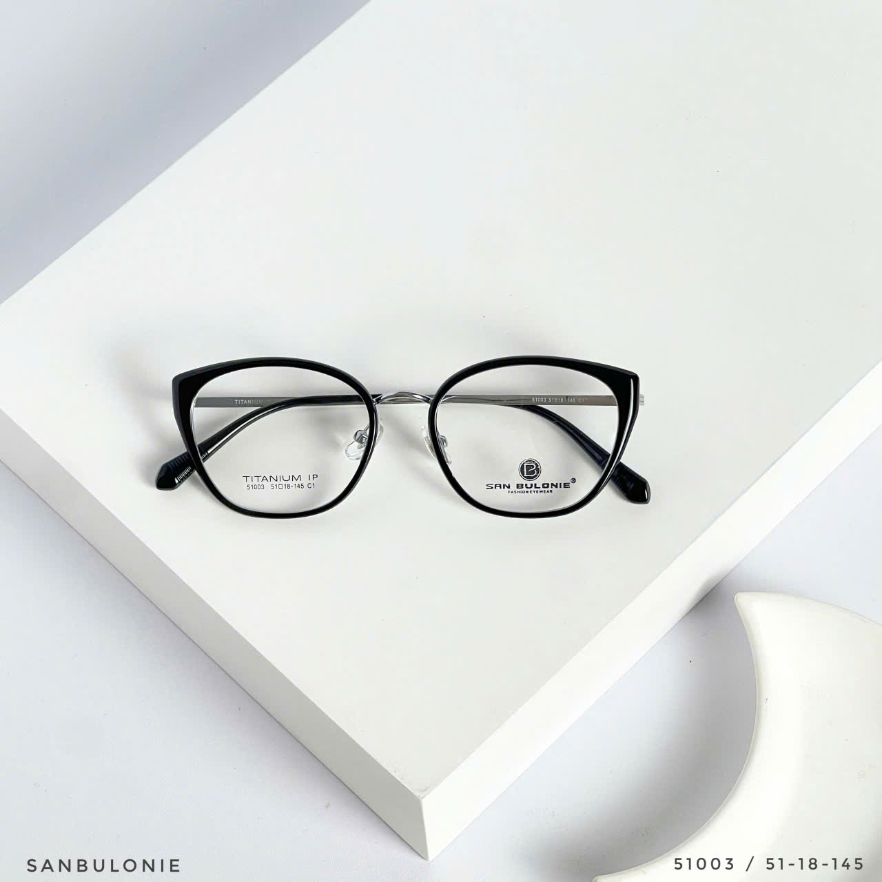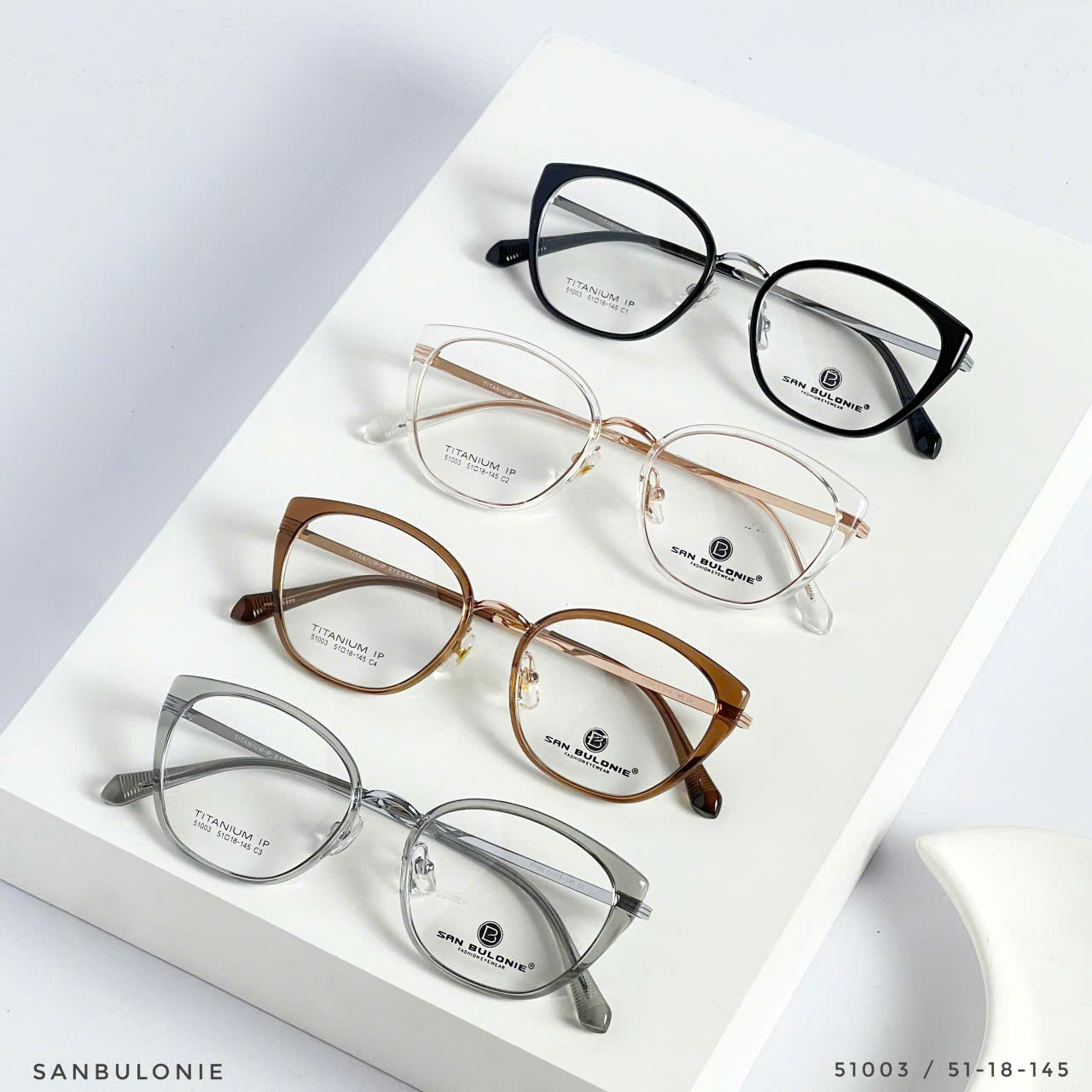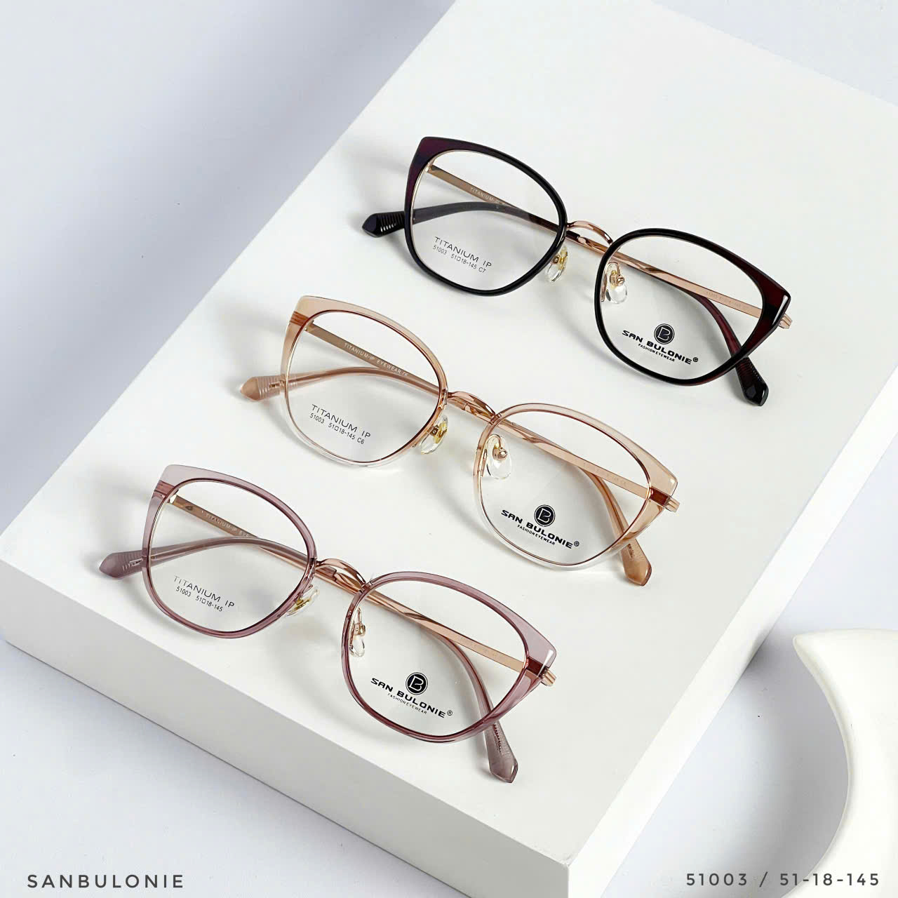 Kính SANBULONIE Titanium 51003 sở hữu thiết kế mắt mèo bo mềm, vừa cá tính vừa giữ được sự tinh tế, giúp khuôn mặt trông thon gọn và hài hòa hơn. Gọng được chế tác từ Titanium IP cao cấp, siêu nhẹ, chống oxy hóa và mang lại cảm giác đeo thoải mái cả ngày.