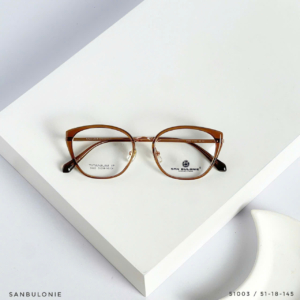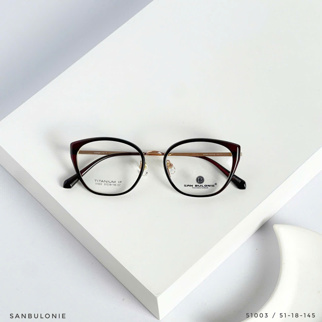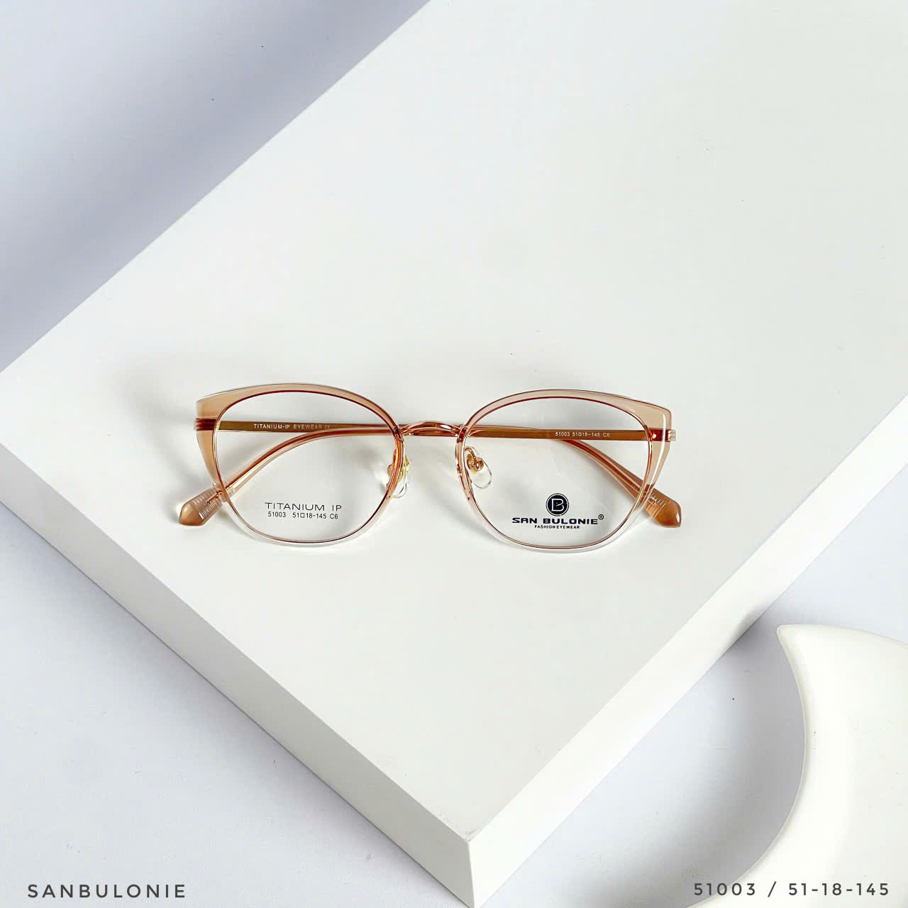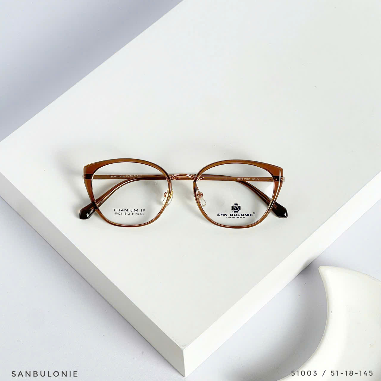 Kính SANBULONIE Titanium 51003 sở hữu thiết kế mắt mèo bo mềm, vừa cá tính vừa giữ được sự tinh tế, giúp khuôn mặt trông thon gọn và hài hòa hơn. Gọng được chế tác từ Titanium IP cao cấp, siêu nhẹ, chống oxy hóa và mang lại cảm giác đeo thoải mái cả ngày.