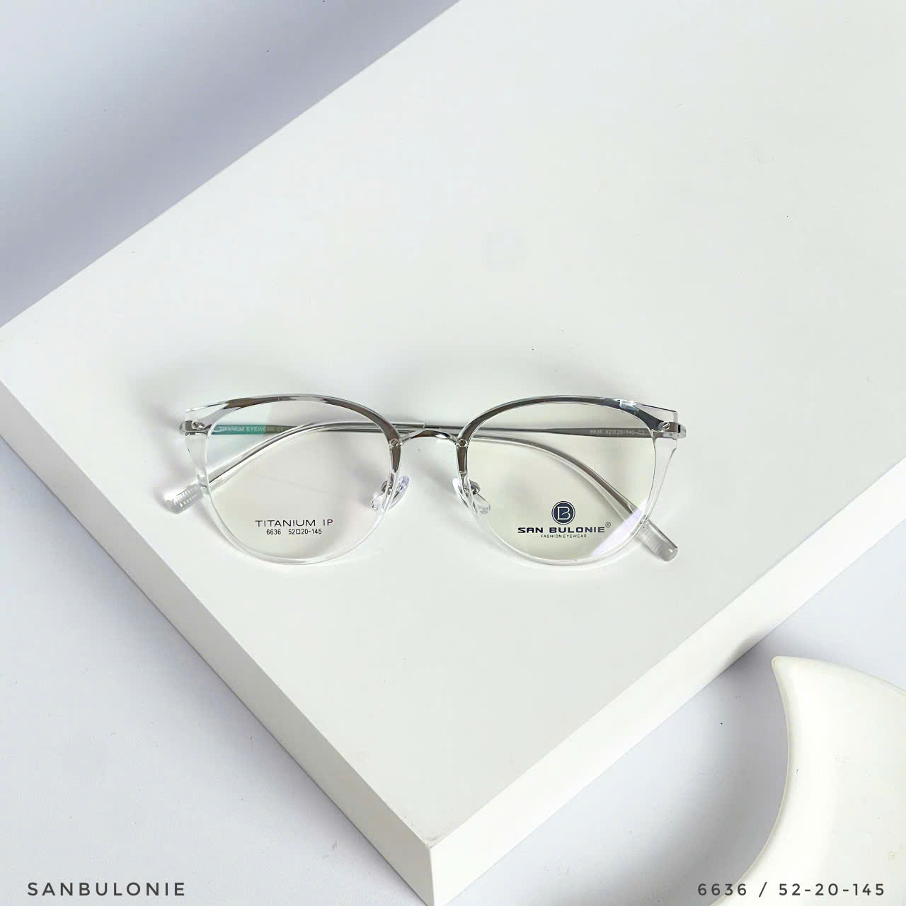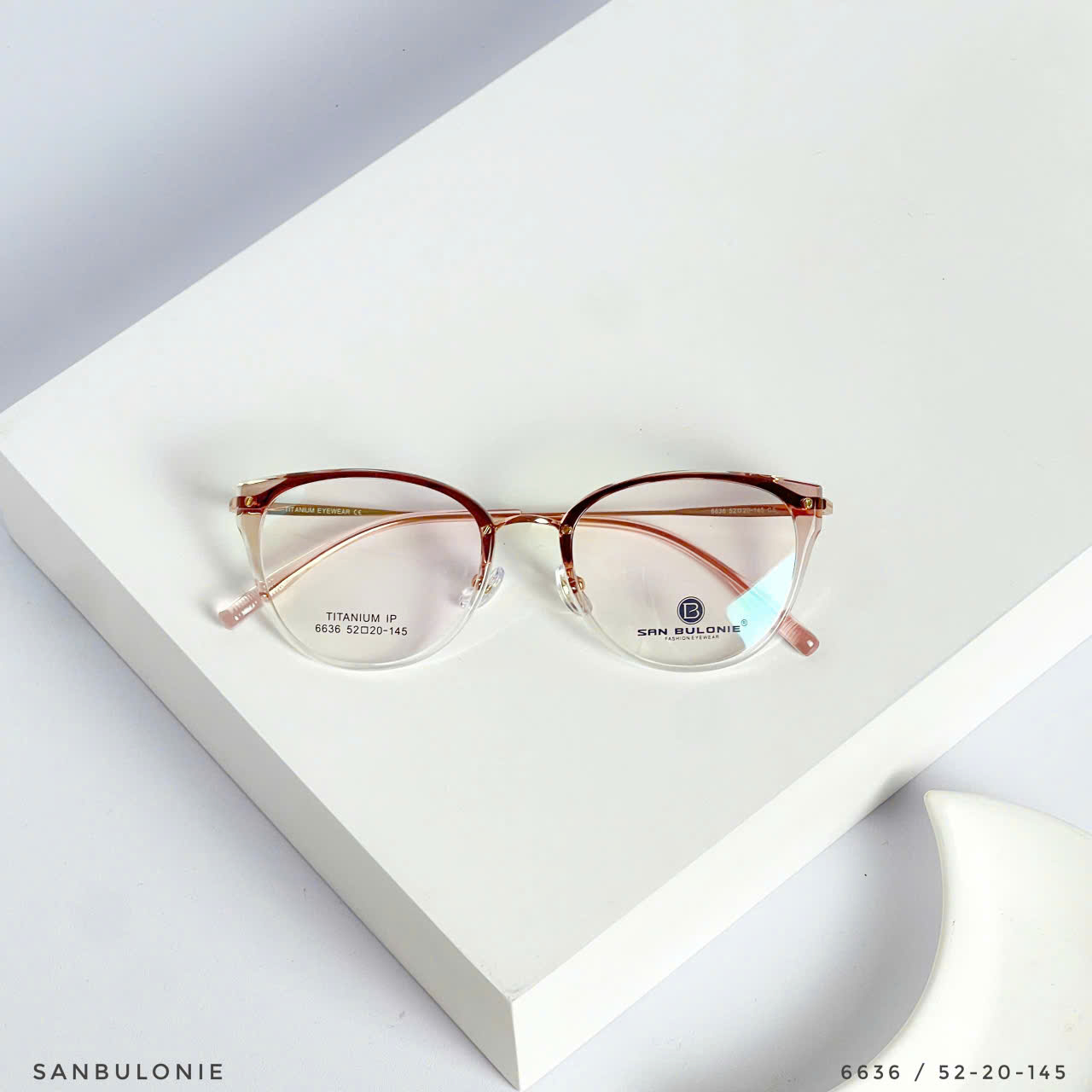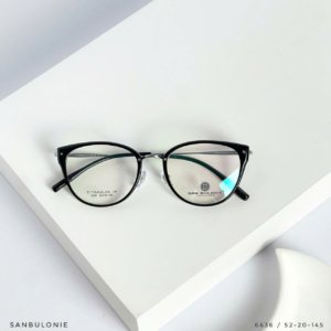 Kính SANBULONIE Titanium 6636 là lựa chọn hoàn hảo cho khách hàng yêu thích phong cách mắt mèo thời trang, vừa thanh lịch vừa trẻ trung. Gọng được làm từ Titanium IP cao cấp, siêu nhẹ, chống gỉ và cực bền, giúp đeo cả ngày mà vẫn thoải mái.