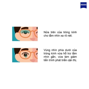 Giải pháp Myokids của Zeiss với nửa trên tròng kính có chức năng điều chỉnh độ cận mang lại tầm nhìn rõ nét khi nhìn ở cự ly xa. Đồng thời vùng hoạt động bên dưới hỗ trợ khả năng nhìn gần và làm giảm đi tiến trình cận thị mà không có bất kỳ tác dụng phụ nào.